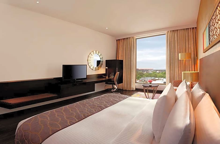 King Executive Room With Aravalli Range View includes a king-size bed 150-183 width plus desk, ironing set, and bathrobes.
